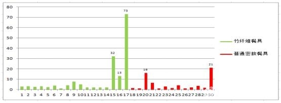 本次比较试验对17件竹纤维餐具和13件普通密胺餐具的材质进行了检测。测试结果显示,28件样品表层与内层材料均为三聚氰胺甲醛树脂,2件样品分别检出脲醛树脂与聚氨酯,其中标称由广州好耐日用品有限公司生产的密胺仿瓷餐盘五格(标称商标: