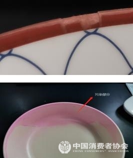 密胺类餐具时常出入厨房,免不了在湿热环境下放置或使用,“耐高温”“不易碎”等常常成为商家宣传的“卖点”,耐湿热性主要考核的就是产品在湿热环境下的品质。另外,日常使用中,食物的颜色、残渣等会沾染在餐具上,餐具到底耐不耐脏,也是消费者关心的一个方面。本次比较试验结果显示,耐湿热测试后,有5件样品产生裂纹,其中4件为竹纤维餐具,1件为普通密胺餐具,如标称由广州简米餐具有限公司生产的网纹山水8.5英寸面碗,经相关测试后,边缘出现裂纹(详见图二);4件样品的耐污染性较差,其中3件为竹纤维餐具,1件为普通密胺餐具,如标称由安徽轻工国际贸易股份有限公司生产的天然竹纤维多用浅碗,经相关测试后,有明显污染(详见图三)。