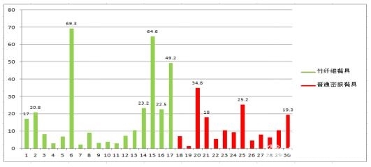 表一 4%乙酸环境下竹纤维餐具与普通密胺餐具部分测试指标和数据对比