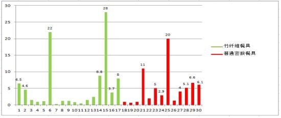 | 测试项目 | 竹纤维餐具 (迁移量均值) | 普通密胺餐具 (迁移量均值) |
