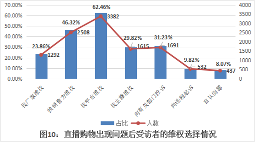 如果遇到直播带货问题,消费者该如何维权?调查结果显示,62.46%的受访者选择找平台维权,46.32%的受访者选择找销售商家维权,31.23%的受访者选择向有关部门投诉,29.82%的受访者选择找主播维权,23.86%的受访者选择找厂家维权,9.82%的受访者选择向法院起诉,8.07%的受访者选择自认倒霉。调查结果说明,遇到直播带货问题后,找平台维权的人最多,其次是找销售商家维权、向有关部门投诉和找主播维权。