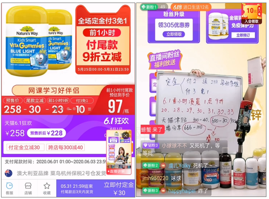 体验样本一:体验人员于2020年5月28日通过天猫直播选购一款预售“Nature'sWay佳思敏儿童防蓝光护眼软糖50粒*2叶黄素缓解眼睛疲劳”,需要事先支付30元定金,6月1日01:00开始支付尾款。体验人员在体验过程中感觉消费环节不是很顺畅,具体情况为:一是打折优惠信息繁琐。很难准确理解各种优惠信息,如“定金付2送价值288元孕妇多维”,“定金付3免1”,“6月1日凌晨1点9折”,“天猫津贴满300-40、满600-80,满900-120”,“直播分享666-100”,“直播间分享券,交尾款当天优惠”等,连主播自己也说活动很大,算不清楚。二是付款手续不便捷。比如,5月28日下单只能支付定金,要等到6月1日才可支付尾款,且需在6月1日凌晨1-2点才能享受9折优惠,发货时间为付尾款后3天。三是下单前需先交30元定金。主播表示,所有海外店铺不接受7天无理由退货,下单预售商品需先交30元定金,并选择“我已同意定金不退”等预售协议,否则无法提交订单。同时提示“提交订单则表示您同意服务和授权协议、消费者告知书、代理购汇及配送服务协议等”。最终体验人员选择了放弃购买。