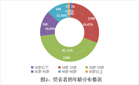 调查结果显示, 26-35岁受访者占42.11%,18-25岁受访者占29.47%,两者总和达到71.58%;36-45岁受访者占14.04%;46-60岁受访者占11.93%;18岁以下的受访者占1.40%;60岁以上的受访者占1.05%。调查结果说明,本次调查受访者以中青年人居多,60岁以上的老年人和18岁以下的未成年人受访者都很少。