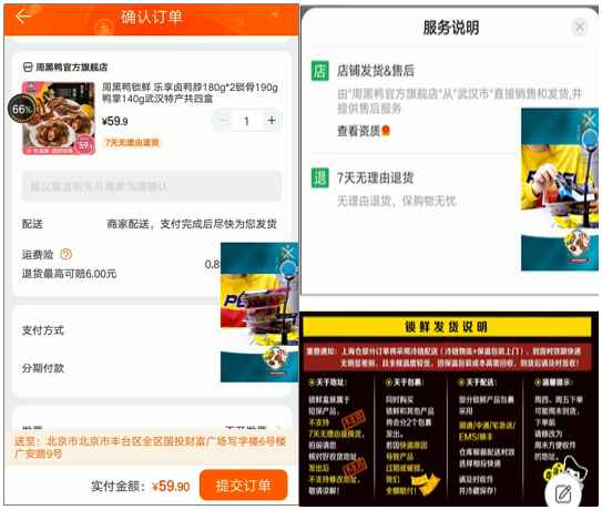 | 周黑鸭官方旗舰店 | 已公示 | 退货不成功 | 没发现 | 商品信息和订单页面标注“7天无理由退货”,但商品详情部分有提示锁鲜产品不支持“7天无理由退货”。最后退货不成功。 | ||