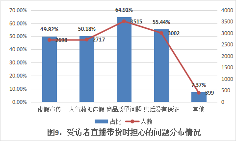 消费者直播购物时担心哪些问题?调查结果显示,有64.91%的受访者担心商品质量,55.44%的受访者担心没有售后保证,50.18%的受访者担心虚假宣传,49.82%的受访者担心人气数据造假,7.37%的受访者担心其它问题。调查结果说明,受访者直播购物时最担心商品质量问题,其次是担心售后没有保证、虚假宣传和人气数据造假问题。