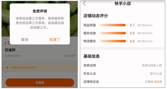 本次体验调查的直播平台商家为快手小店“崔娜娜”。商家公示了营业执照及商家相关信息“实名认证:已实名认证;店铺保证金:已缴纳30000元”。
