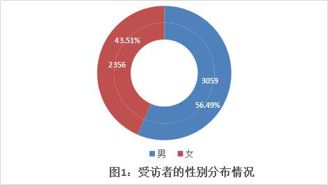 调查结果显示,在5415名受访者中,男性受访者3059名,占比56.49%;女性受访者2356名,占比43.51%。说明本次调查受访者以男性居多。