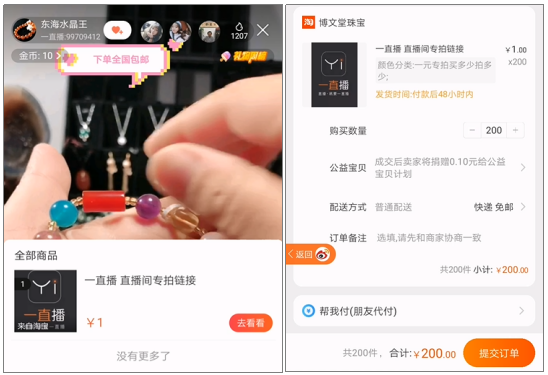体验样本三:体验人员于2020年5月28日通过微博一直播选购了一款盐源玛瑙手串,主播直播介绍完商品信息和商品价格,体验人员支付了69元购买。购买渠道通过微博一直播间专拍链接到淘宝店铺,1元专拍买多少拍多少,选择购买数量69,下单购买成功。此次直播消费体验发现,所有的商品信息均由主播直播介绍,平台上没有任何商品图片或文字信息。6月1日体验人员收到商品后,以“尺寸大小不符”为由申请退货,6月2日完成退货,体验人员承担退换运费。