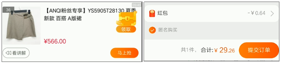 体验样本三:体验人员于2020年5月30日通过淘宝直播选购了一款“【ANQI粉丝专享】YS5905T28130夏季新款百掿A版裙”,标价566元,下单实际购买价格29.26元。平台商品信息标注“7天无理由,付款后15内发货”。6月1日,体验人员收到货后以商品发错颜色原因申请退货,商家让把退货原因修改为效果差或其他原因,“最近小安琪在考核,修改对您没有影响,对小安琪会比较好。”6月4日退货成功,因商家过错,商家退回运费12元。