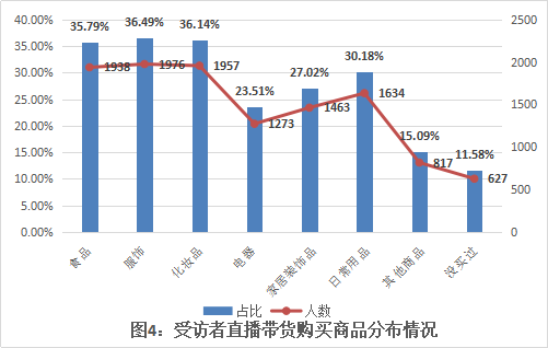 4、直播带货最多的商品分别是服饰、化妆品和食品
