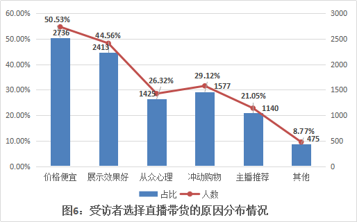 6、选择直播带货的主要原因是价格便宜和展示效果好
