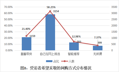 调查结果显示,有58.25%的受访者喜欢自己在网上挑选商品,21.4%的受访者喜欢通过直播带货方式购物,12.98%的受访者喜欢通过智能推荐方式购物,另有7.37%的受访者对购物方式无所谓。调查结果说明,受访者网购时最喜欢自己在网上挑选商品,真正喜欢直播带货和智能推荐购物的受访者不多。