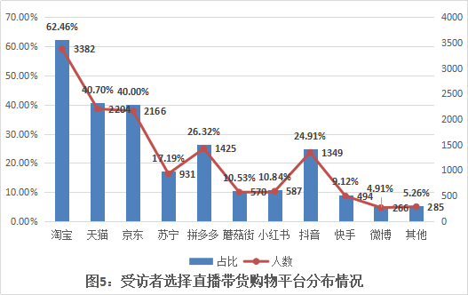 5、选择淘宝、天猫和京东直播购物的受访者最多