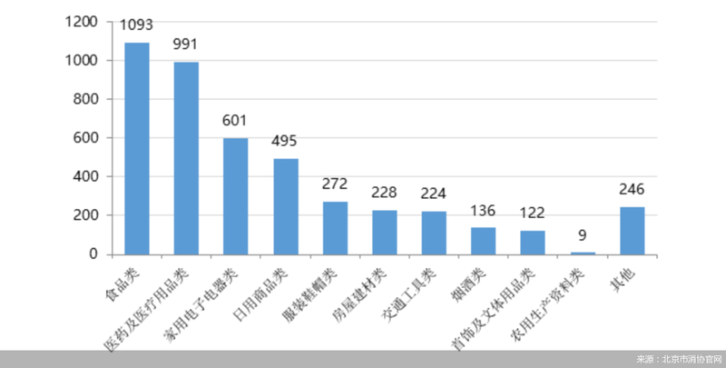 具体来看,在4417件商品类投诉中,食品投诉最多,其次是医药及医疗用品投诉、家用电子电器投诉和日用商品投诉。其中,食品类投诉1093件,占商品类投诉总量的24.75%;医药及医疗用品类投诉991件,占商品类投诉的22.44%;家用电子电器类投诉601件,占商品类投诉的13.61%;日用商品类投诉495件,占商品类投诉的11.21%;服装鞋帽类投诉272件,占商品类投诉的6.16%。