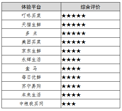 为此,北京市消协选取天猫生鲜、京东生鲜、美团买菜、盒马、多点、每日优鲜等11个生鲜电商平台APP作为体验调查对象。调查报告显示,叮咚买菜、天猫生鲜、多点和美团买菜等4个平台APP的综合评价为最高五颗星;只有中粮我买网的综合评价为最低3颗星。