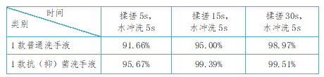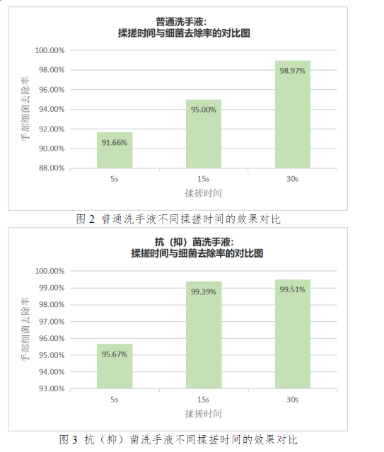 检测结果显示,上述普通洗手液和抗(抑)菌洗手液,在30s内,揉搓时间越久,去除细菌的效果越好。