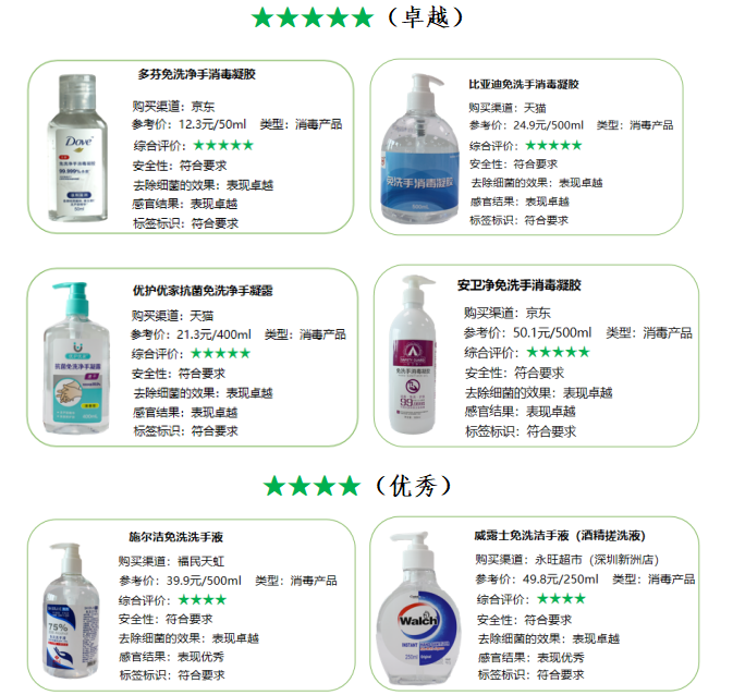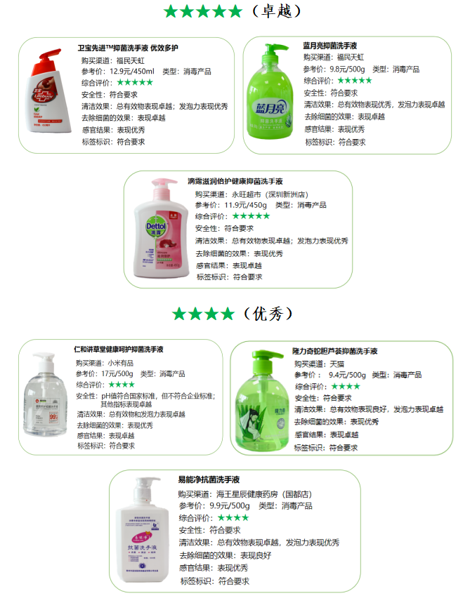 1. 本次比较试验从安全性、清洁能力、去除细菌的效果、感官评价及标签标识五个方面对普通洗手液及抗(抑)菌洗手液进行测评,从安全性、去除细菌的效果、感官评价和标签标识四个方面对免洗洗手液(有效成分以酒精为主)进行测评,共9款样品获评五星评价