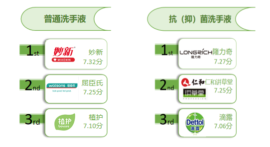 30位体验官感官评价结果显示,普通洗手液中的妙新、屈臣氏、植护,抗(抑)菌洗手液中的隆力奇、仁和讲草堂、滴露感官综合评价表现突出。