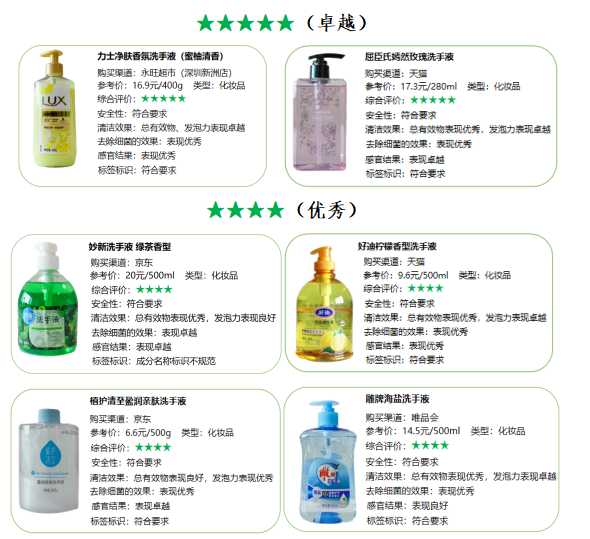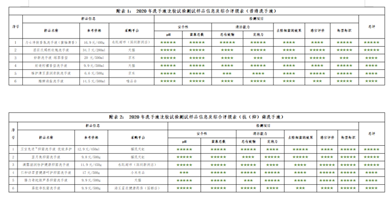备注: 1. 本次比较试验所有样品均由工作人员以普通消费者身份通过正规销售渠道购买; 2. 总评权重: 普通洗手液:安全性20%,清洁能力35%(总有效物25%,发泡力10%),去除细菌的效果10%,感官评价为30%,标签标识5%; 抗(抑)菌洗手液:安全性为20%,清洁能力20%(总有效物15%,发泡力5%),去除细菌的效果25%,感官评价为30%,标签标识5%; 免洗洗手液:安全性20%,去除细菌的效果45%,感官评价为30%,标签标识5%; 3. 感官评价: 1)普通洗手液+抗(抑)菌洗手液:分散性、易冲洗程度、紧绷感、脱脂性、刺激性;免洗洗手液:黏腻感、刺激性、用后干燥性; 2)评价前对每位体验官进行培训,讲解评价内容、指标和方法,并对待测样品进行外包装处理和编号。测评时,体验官对照标准样品,对待测样品进行盲测,标准样品为6分,待测样品评分范围为1~10分,表现越好,评分越高。单项指标得分为去掉一个最高分,去掉一个最低分,计算平均分。本次感官评价结果建立在消费者主观评价基础之上,仅供参考; 4. 评价结果用“★”表示,“★”越多结果越好,同星级样品排名不分先后; 星级不等于分数; 5. 本次比较试验评价结果基于本次试验检测结果和体验官的感官评价; 6. 本次比较试验结果仅对所购买的样品负责,结果仅供消费者参考,不代表同品牌不同批次、不同规格产品的质量状况,不构成对相关产品的推荐与宣传; 7. 未经深圳市、福田区和宝安区消委会书面允许,任何单位和个人不得擅自使用本次比较试验结果作为商业宣传。