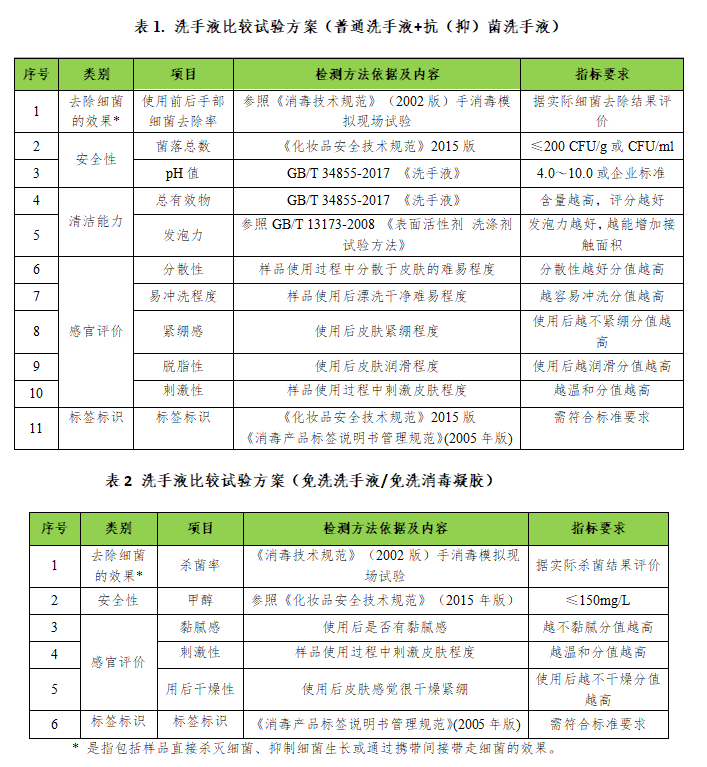 二、试验采用的标准及方法 本次比较试验检测项目广泛征求了企业、业内专家和第三方检测机构的意见,依据现行国家标准GB/T 34855-2017 《洗手液》、GB 19877.1-2005《特种洗手液》、《化妆品安全技术规范》(2015版)、《消毒技术规范》(2002版)等标准、法规要求,采用国家标准方法等进行检测,从安全性、清洁能力、去除细菌的效果和感官评价等几大方面展开洗手液品质测评,详细项目与要求见表1及表2。