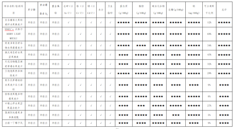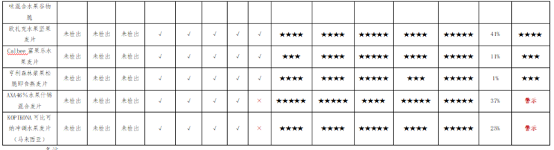 备注: 1. 本次比较试验所有样品均由工作人员以普通消费者身份通过正规销售渠道购买; 2. 安全指标(黄曲霉毒素B1、草甘膦、重金属)和卫生指标(霉菌、菌落总数、大肠菌群)占30%权重,营养指标(蛋白质、脂肪、碳水化合物供能比例,钠、含糖情况)70%权重,综合评级; 3. 2款样品(AXA46%水果什锦混合麦片、KOPIKONA可比可纳冲调水果麦片)霉菌指标超出GB 19640-2016《食品安全国家标准 冲调谷物制品》的限量值,予以警示,不参与本次评级; 4. 本次比较试验的果干占比为可分离果干的占比,部分品牌麦片和果干黏连在一起,无法分开; 5. 果干占比以重量计,冻干果干比果脯类果干重量轻; 6. 评价结果用“★”表示,“★”越多结果越好,同星级样品排名不分先后; 7. 本次比较试验结果仅对所购买的产品负责,结果仅供消费者选购产品参考,不代表同品牌不同批次,不同规格产品的质量状况,不构成对任何相关产品的推荐与宣传; 8. 未经深圳市消委会书面允许,任何单位和个人不得擅自使用本次比较试验结果作为商业宣传。