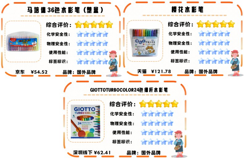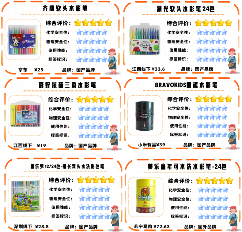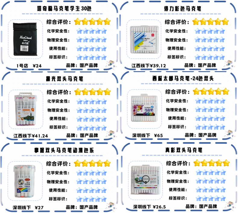 本次比较试验站在消费者视角,针对消费者关注的化学安全性、物理安全性、标签标识、使用性能等问题,参照国家标准及欧盟标准对水彩笔、马克笔开展比较测试并进行分级评价,以更多更严的标准为消费者提供正确的消费信息、消费指导。 一、测试指标设定原则:更多更严当前水彩笔、马克笔产品主要执行的标准有强制性国家标准GB 21027-2007《学生用品的安全通用要求》、轻工行业标准QB/T 2777-2015《记号笔》,两项标准暂未对消费者高度关注的安全问题如防腐剂、邻苯二甲酸酯类以及多环芳烃等进行相关要求。本次比较试验遵循以下两个原则,选取国内相关标准以及国际一流标准进行检测,满足消费者品质消费需求。 原则一:更多。综合国家标准、欧盟标准选取项目指标数量更多的标准进行测试。如:针对特定元素迁移,本次在国标8种特定元素迁移基础上采用指标数量更多且限制更严的欧盟标准对19种特定元素迁移进行测试。 原则二:更严。根据国家标准、欧盟标准选取项目指标限值更严或国内无要求的标准进行测试。如:国内水彩笔、马克笔相关标准对邻苯二甲酸酯类、多环芳烃、防腐剂暂无要求,本次比较试验根据水彩笔、马克笔材质特点,引入指标数量更多且限制更严的欧盟标准对邻苯二甲酸酯类、多环芳烃、防腐剂含量进行测试。 二、分级评价标准,接轨国际通行做法 通过标准的对比发现我国水彩笔、马克笔标准中安全要求、安全性能应控制的范围及安全限量存在一定滞后。因此,充分听取业内专家、检测机构、企业及消费者意见后,综合国家标准、国家行业标准和欧盟标准本着从严要求选取安全性更高的指标制定了本次儿童文具(水彩笔、马克笔)比较试验测试指标。 根据《中共中央 国务院关于开展质量提升行动的指导意见》中“建立质量分级制度,引导完善第三方质量评价体系”的要求。按照国际消费者组织通行的分级评价标准开展本次比较试验,“★”越多结果越好,同星级样品排名不分先后。 三、9款水彩笔、10款马克笔品质领跑,国产品牌占15款 根据国务院办公厅印发《消费品标准和质量提升规划(2016-2020年)》(国办发[2016]68号)“建立企标领跑者制度,引导消费者更多选择标准领跑者产品”的要求。为营造“生产看领跑,消费选领跑 ”的氛围,根据比较试验相关规则评选出19款符合本次比较试验制定的更多更严标准要求品质领跑的水彩笔、马克笔,分别是:齐心软头水彩笔、晨光软头水彩笔24色、爱好抗菌三角水彩笔、BRAVOKIDS童趣水彩笔、富乐梦12/24色-细长双头水洗彩色笔、Touchmark马克笔30色套装、英雄24色油性马克笔、马可Raffine30支装马克笔专业套装、宝克自然风油性双头马克笔24色、塔奇酷马克笔学生30色、得力彩色马克笔、晨光双头马克笔、西瓜太郎马克笔-24色双头、掌握双头马克笔动漫色系、真彩双头马克笔、樱花水彩笔、GIOTTOTURBOCOLOR24色细杆水彩笔、美乐童年可水洗水彩笔-24、马培德36色水彩笔(塑盒)。 四、比较试验结果