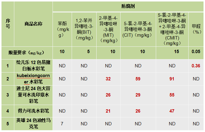 目前国内标准对水彩笔、马克笔中防腐剂未做出明确规定,故本次参考欧盟 EN 71-9 : 2005+A1 : 2007 《玩具安全-第9部分 有机化合物限制要求》对六种防腐剂含量进行了限定(苯酚≤10mg/kg、BIT≤5mg/kg、MIT≤10mg/kg、CIT≤10mg/kg、CMIT≤15mg/kg、甲醛≤0.05%)。