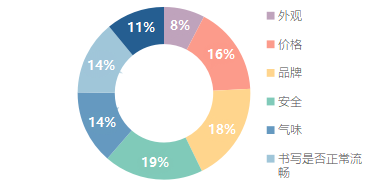 3. 消费者购买水彩笔/马克笔时多考虑品牌及安全方面,占比均为19%。