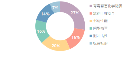 4. 有毒有害化学物质是消费者最关心的测试项目,占比27%。其次为书写性能,占比20%。