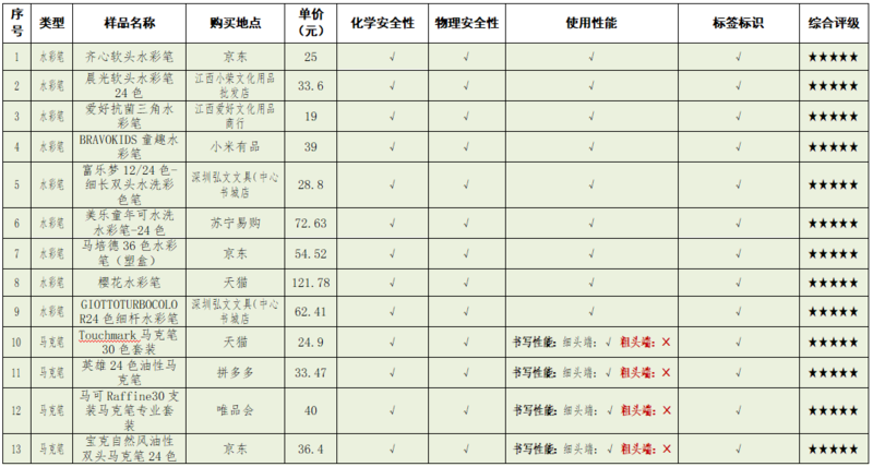 备注:1.本次比较试验所有样品均由工作人员以普通消费者身份通过正规销售渠道购买。结果仅供消费者参考,不构成对相关产品的推荐与宣传;2.本次比较试验按照国际消费者组织通行的分级评价标准开展,“★”越多表示结果越好,同星级样品排名不分先后;3.本次比较试验包括化学安全性(邻苯二甲酸酯类、多环芳烃、特定元素迁移、防腐剂)、物理安全性(笔的上帽安全)、使用性能(书写性能、间歇书写、耐冲击性、笔套拉力、笔头滑缩力、笔头强度)、标签标识四大类测试指标;4.汇总表中“√”表示符合相关标准要求,“×”表示不符合相关标准要求;5.本次比较试验结果仅对所购买的样品负责,不代表同品牌不同批次、不同规格产品的质量状况;6.未经江西省消费者权益保护委员会、深圳市消费者委员会、福田区消费者委员会、宝安区消费者委员会书面允许,任何单位和个人不得擅自使用本次比较试验结果作为商业宣传。