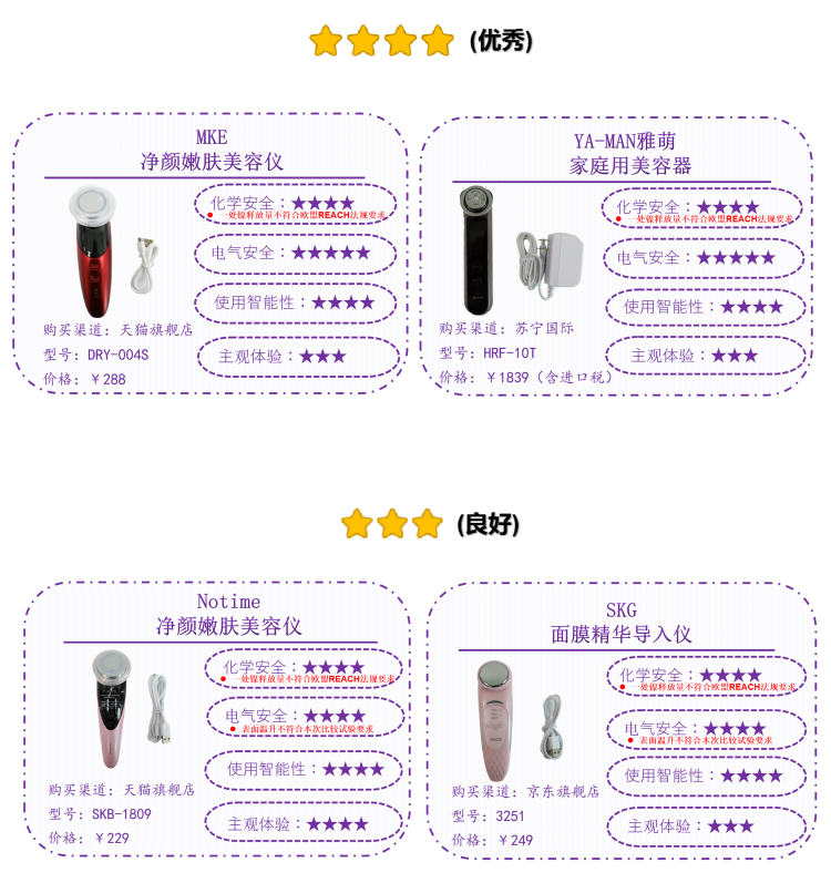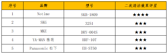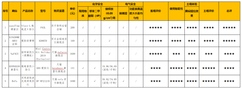 备注: 1. 本次比较试验所有样品均由市消委会工作人员以普通消费者身份通过正规销售渠道购买; 2.化学安全指标:限用物质(铅、汞、镉、六价铬、多溴联苯和多溴二苯醚)、邻苯二甲酸酯(4P)、镍释放量; 3.电气安全指标:耐潮湿、功能表面温度大小及均匀性; 4.使用智能性指标:产品外观做工、产品手柄结构、产品档位控、说明书易读性、工作状态提醒; 5.主观体验指标:瞬间提拉效果、二次清洁效果、温热导入效果; 6.客观评价:化学安全指标和电气安全指标;主观评价:使用智能性指标和主观体验指标; 7.测试指标结果用“√”表示测试结果未检出;“/”表示样品未含有此物质或未有此功能; 8.评价结果用“★”表示,“★”越多结果越好,同星级产品排名不分先后; 9.本次比较试验结果仅对所购买的样品负责,结果仅供消费者参考,不代表同品牌不同批次、不同规格产品的质量状况,不构成对相关产品的推荐与宣传; 10.未经深圳市消委会书面允许,任何单位和个人不得擅自使用本次比较试验结果作为商业宣传。(来源:深圳市消费者委员会)