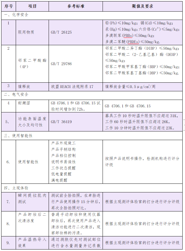 二、测试标准及方法家用美容仪产品目前在我国主要归类为皮肤及毛发护理器具,且单相器具额定电压不超过250V,则该产品应执行标准为国家强制性标准GB 4706.1-2005 《家用和类似用途电器的安全 第1部分 通用要求》。其次,还有一个专门针对美容仪的标准GB/T 36419-2018 《家用和类似用途皮肤美容器》在行业内使用。 本次比较试验更关注消费者健康安全和使用体验,多项指标参照国内外的相关标准法规等,如邻苯二甲酸酯、镍释放量两个指标参照GB/T 29786-2013《电子电气产品中邻苯二甲酸酯的测定 气相色谱-质谱联用法》和镍释放量参照了欧盟REACH法规要求EN 1811: 2011 + A1: 2015的相关规定要求;而在电气安全能方面参考了国家推荐行标准GB/T 36419-2018 《家用和类似用途皮肤美容器》的相关要求进行测试。 为贴合消费者实际使用情况,本次比较试验从化学安全、电气安全、使用智能性、主观体验四个方面设置指标参照国内外的相关标准法规进行测试。