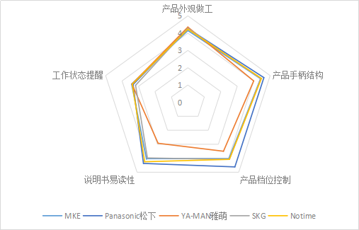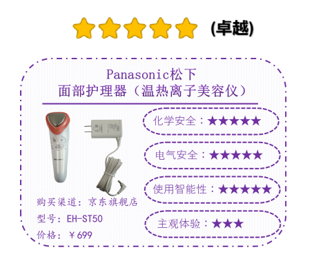 2. 电离子型美容仪 结果显示,5款电离子型家用美容仪中YA-MAN雅萌家庭用美容器因为海外购产品,产品说明书为全日文文字,普通消费难以读懂说明书内容。Panasonic松下面部护理器(温热离子美容仪)在各项得分中较为突出,得分最高。具体结果如下: