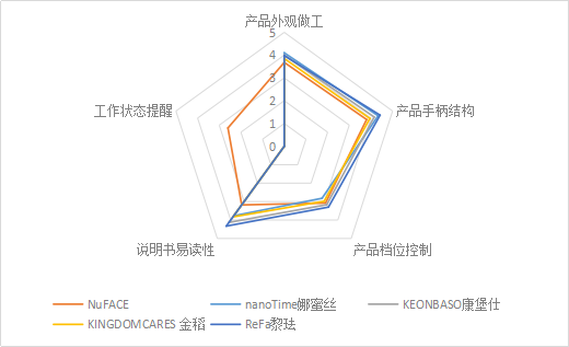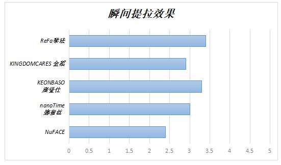 (四)主观体验 1. 瞬间提拉效果 前期调研结果显示,消费者对家用美容仪的产品广告宣传提拉紧致效果非常关注。本次比较试验专门针对5款微电流型家用美容仪的提拉紧致效果进行了现场体验,体验官在测试前全脸拍照,在单脸使用产品进行推拉操作15分钟后,再次全脸拍照对比评分,此项评测满分5分;最终根据消费者体验打分,分数较高的为进口品牌ReFa黎珐和国产品牌KEONBASO康堡仕。而分数较低的美国品牌NuFACE样品,消费者在使用过程中均表示产品调至中高档位时电流感过大,体验感不好。具体评分结果如下: