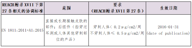 表2. 欧盟EN1811:2011+A1:2015镍释放量限量要求