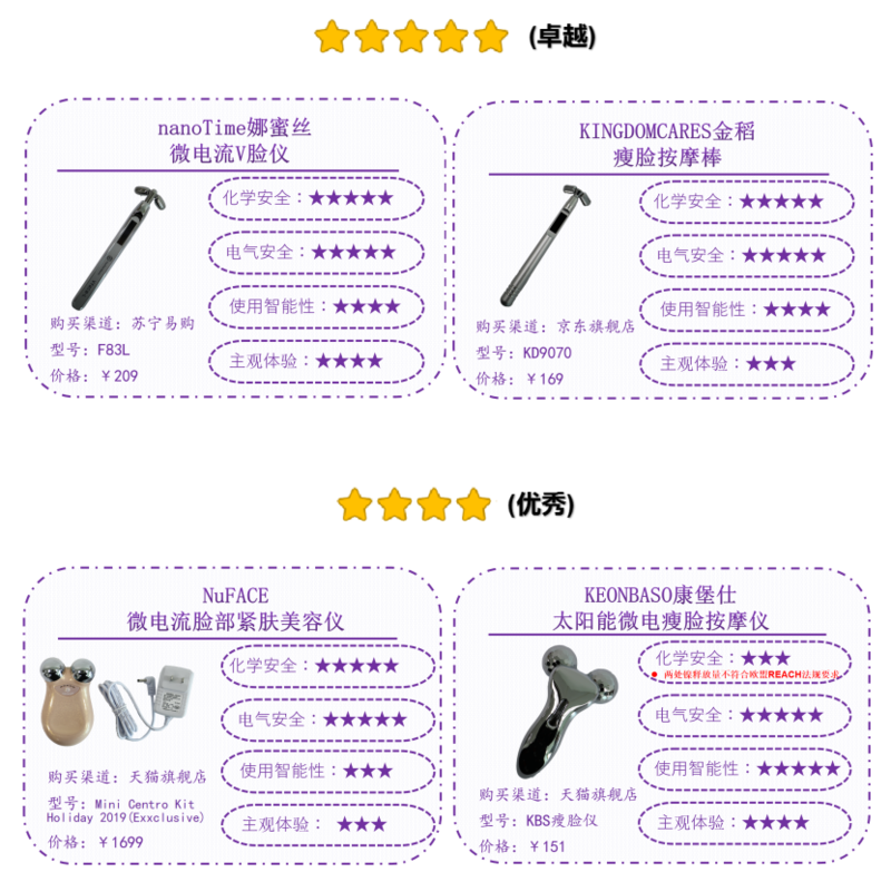 本次家用美容仪比较试验站在消费者视角,针对消费者关注的化学安全、电气安全、使用智能性、主观体验等维度,参照国内外相关标准对家用美容仪产品开展测试并进行分级评价。 一、2款微电流型家用美容仪和1款电离子型美容仪品质领跑表现卓越,分别为:国产品牌nanoTime 娜蜜丝F83L微电流V脸仪和KINGDOMCARES金稻 KD9070瘦脸按摩棒;日本品牌Panasonic松下 EH-ST50面部护理器(温热离子美容仪)。 二、10款家用美容仪样品中6款样品镍释放量测试结果不符合欧盟REACH法规要求,存在致敏风险。 三、2款电离子型样品不符合产品功能表面温度大小及均匀性的标准要求,存在着低温烫伤和灼伤皮肤真皮层的风险。 四、ReFa黎珐双球滚轮波光美颜美容仪和Panasonic松下面部护理器(温热离子美容仪)在使用智能性方面较为突出。 五、主观体验测评结果显示10款家用美容仪的瞬间提拉,二次清洁,温热导入效果均不如商家宣传的功效显著。