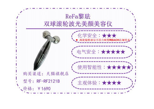 1. 微电流型美容仪 结果显示:5款微电流型家用美容仪样品中有4款没有工作状态提醒功能。其中ReFa黎珐双球滚轮波光美颜美容仪样品在其他四项中得分均较高,具体结果如下: