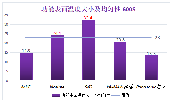 (二)产品安全 1. 10款家用美容仪样品耐潮湿指标均符合国家标准要求。 家用美容仪一般使用场景和放置区都会在环境相对湿度较高的卫生间或者洗漱间。一般带电的产品在潮湿的环境下启动,可能会引起电路短路或者漏电危险。 本次比较试验对家用美容仪的耐潮湿性能进行测试,并将原来标准中的试验时间要求由48小时增加到72小时,以验证产品的更高耐潮湿性。结果显示:10款家用美容仪样品均通过国家标准并达到了本次试验的更高要求。 2. 2款电离子型家用美容仪样品存在低温烫伤的风险。 10款家用美容仪样品中的有5款是微电流型家用美容仪(没有发热功能)和5款电离子型样品,测试的5款带发热功能的电离子型样品中有2款样品的功能表面温度大小及均匀性测试不符合相关标准要求,分别为:SKG和Notime(结果详见图3)。该项不符合标准要求有可能会发生低温烫伤和灼伤皮肤真皮层的风险。