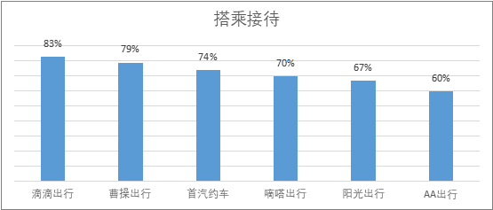 2. 搭乘接待细分服务得分情况 搭乘接待过程达标率最高的是滴滴出行,其次是曹操出行。各大网约车平台在搭乘接待过程中,超过九成司机会在5分钟以内到达指定等待地方并接到乘客,100%的车辆/车牌/司机信息与短信/订单提示一致,78%的司机会为乘客开门、放置行李等,80%的司机车辆外观干净整洁。