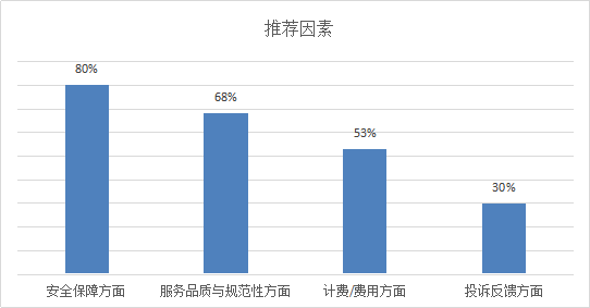 NPS口碑调查中发现,安全保障是消费者的基础需求,服务品质与规范性和费用是消费者的核心需要。消费者推荐网约车平台首要因素是安全保障,推荐率为80%,表明消费者对于网约车的管理充满信心。其次是服务品质与规范性,推荐率为68%;推荐因素第三名是费用,推荐率为53%。