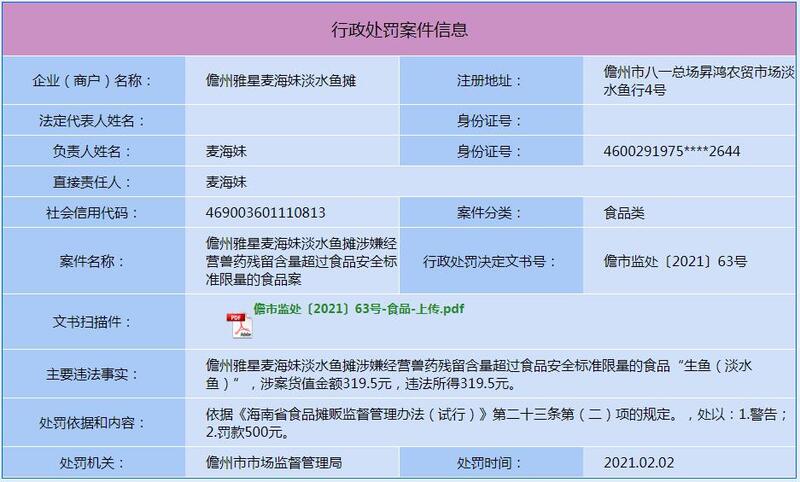 儋州雅星麦海妹淡水鱼摊行政处罚案件信息