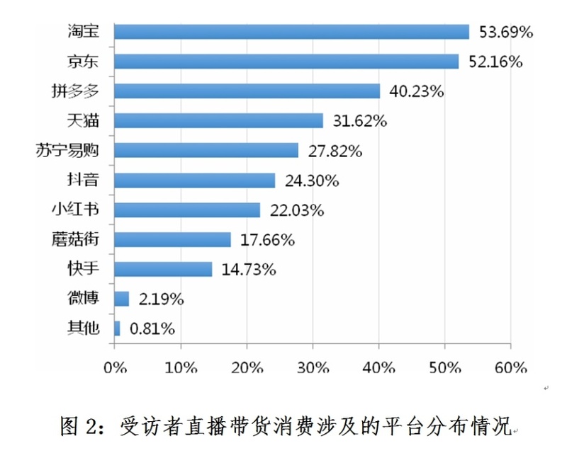 调查结果显示,超6成受访者经常通过直播带货方式购物,通过直播带货购买最多的是化妆品和食品。淘宝、京东等电商平台仍是直播带货主要渠道,抖音、快手和小红书等短视频平台的直播带货业务发展迅猛。调查结果显示,受访者直播带货消费经历排在前三名的平台分别是淘宝、京东和拼多多,占比分别为53.69%、52.16%和40.23%。而在抖音、小红书和快手等短视频平台有直播带货消费经历的受访者,也分别达到了24.3%、22.03%和14.73%。
